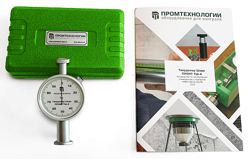 Это простой и надежный механический прибор с металлическим корпусом, индикатором часового типа, поворотным циферблатом для корректной установки нуля и удлиненной контактной площадкой облегчающей применение дюрометра. Внутри устройства установлена тарированная пружина обеспечивающая требуемое усилие на индентор специальной формы из закаленной стали и механизм фиксации его перемещения. Для проведения измерения в соответствии с ГОСТ также потребуется секундомер и термометр. Твердомер Шора ПРОМТ ТШ-А (тип АО/С) не требует специальных навыков для работы с ним и позволяет оперативно контролировать твердость мягких резины и пластиков, силикона, винила и аналогичных материалов в лабораторных и цеховых условиях.