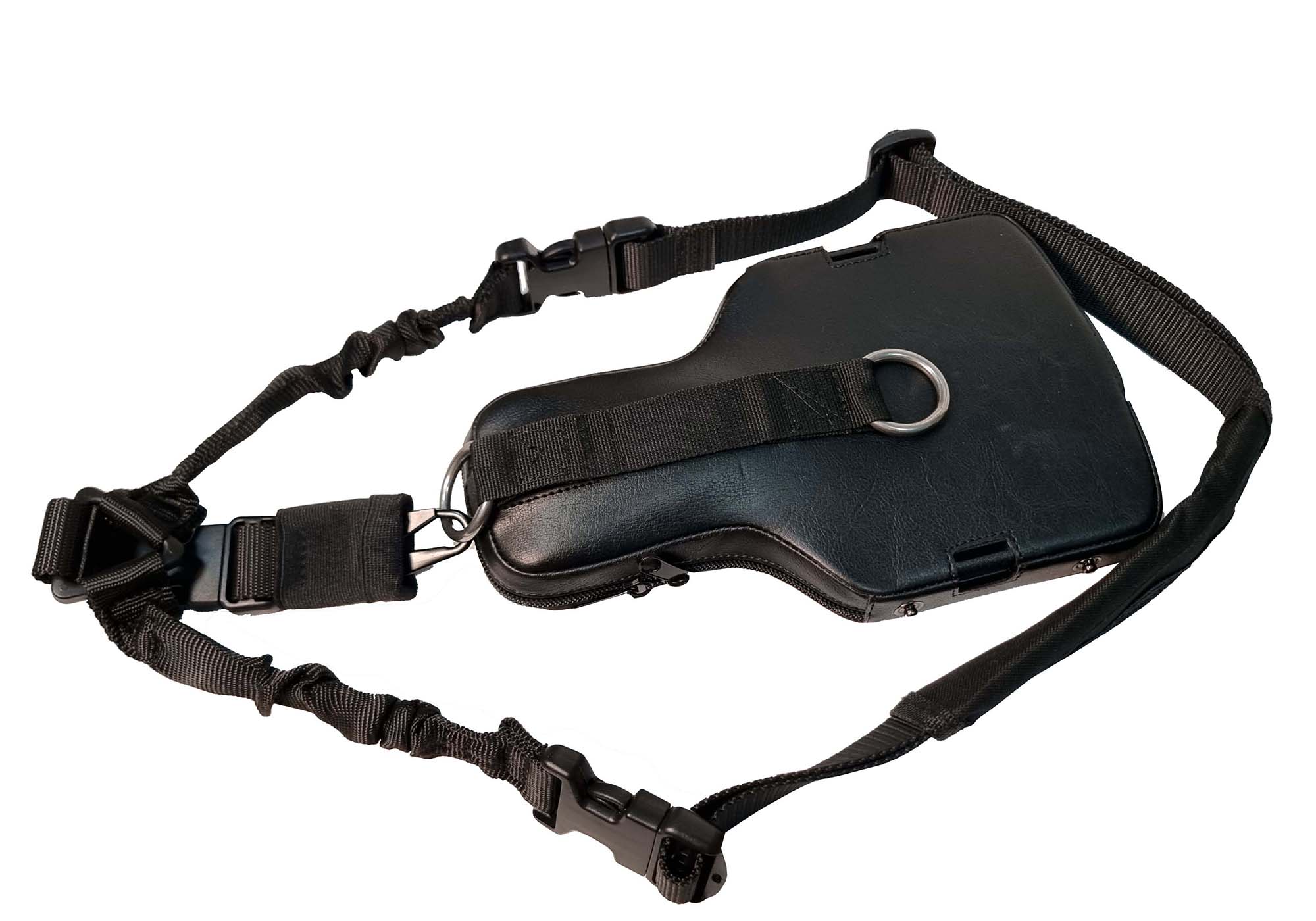 На стандартный чехол D12 для дефектоскопа А1212 MASTER установлены крепежные монолитные металлические кольца, за любое из которых можно закрепить трехточечный тактический ремень-разгрузку. Ремень входит в комплект. При таком креплении прибора дефектоскопист получает большую мобильность в стесненных условиях и при перемещении по лестницам (стремянкам), когда штатный планшет на поясе оператора мешает движению. Ремень имеет три пряжки, позволяющие быстро снять или весь ремень, или отстегнуть при необходимости дефектоскоп.